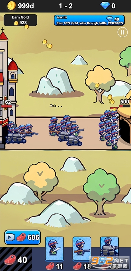 1、通过战斗获取经验值,升级鸭兵提高战斗力和生命值。