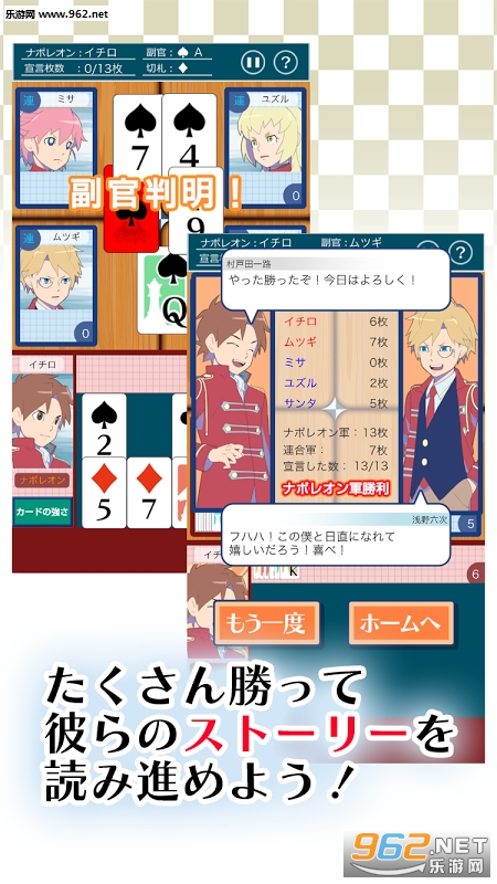 《日直争夺 拿破仑学园》(日直争奪 ナポレオン学園)是一款纸牌对战类游戏。画面带有日系动漫二次元风格,在游戏中玩家需要通过扑克牌的对战去完成挑战任务。