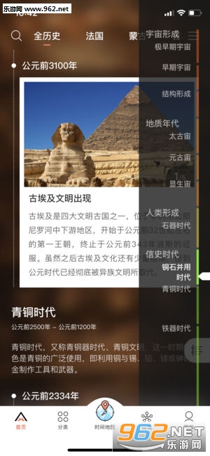 2、时间地图:将时间、地图和历史全面结合,多维度的展示长达130亿年的世界史。