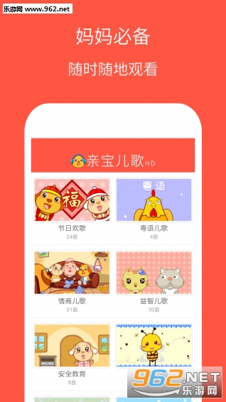 亲宝网制作的儿歌,具有画面清新柔和,声音清脆悦耳,表现方式童真童趣,每一首都配有字幕的特点,适合各年龄阶段的小朋友观看(特别适合0~6岁的宝宝),赶快来下载安装吧!