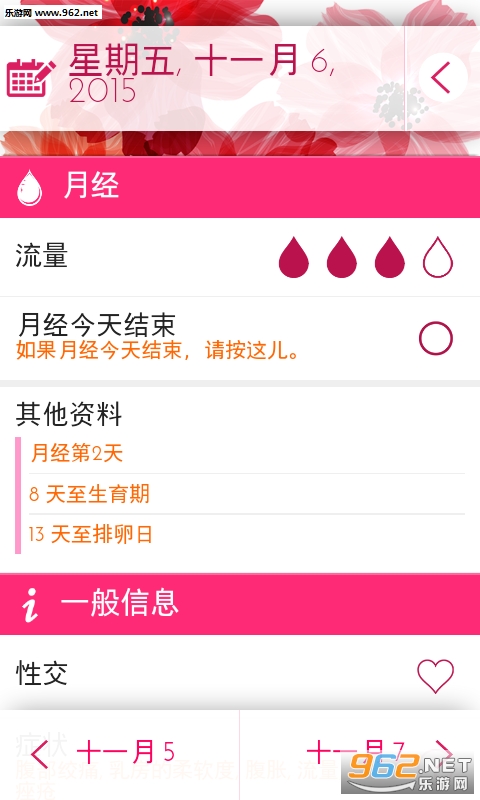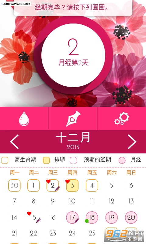 《女性月历app》可记录不规律的经期、体重、温度、心情、月经流量、症状等等。除此之外,女性月历记录app也可以预测受孕期、排卵日和月经期。这个应用程序可依您以往的月经周期可准确的预测您所关心的关键日。