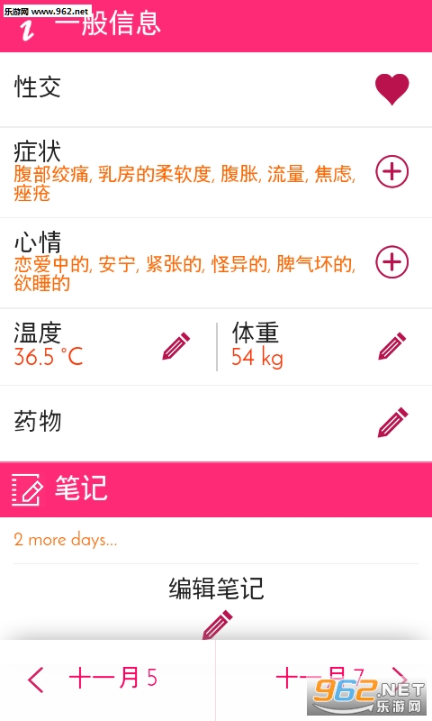 每日记录可让您保存下列信息:流量、症状、心情、温度、体重、药物、经前综合症、其他日记等等