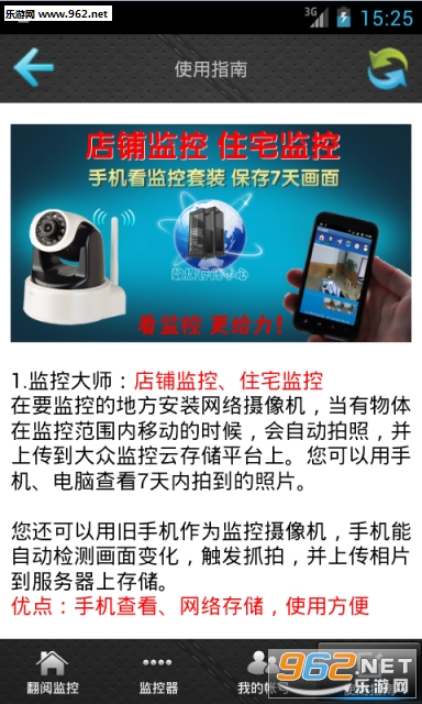 本应用可以将安卓手机变成一个专业的网络监控摄像头,具有24小时监控、移动侦测、报警抓拍、网络保存、短信通知的专业功能。