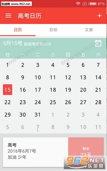 《高考日历2016软件》是一款专门为学子们打造的一款app软件,这款软件以2016最新的时间打造高考日历,让大家珍惜高中最后的校园时光。并且以清新有趣的主题让日历变得更加多元化!