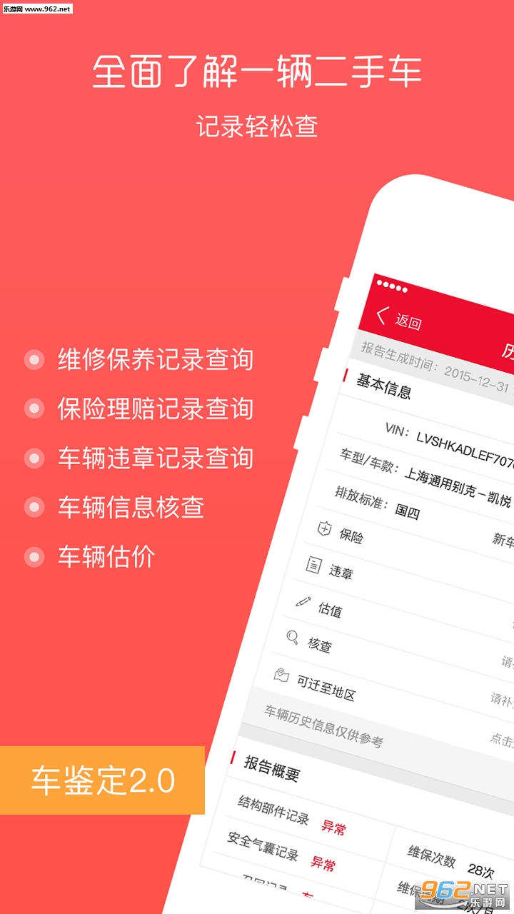 随着国内车辆市场的日益活跃,二手车交易也成为了用户的一大选择‘车鉴定app’帮你根据车辆识别码轻松查询车辆维修保养记录,了解车辆是否有重大事故或者大修等等资料,安心买二手车。