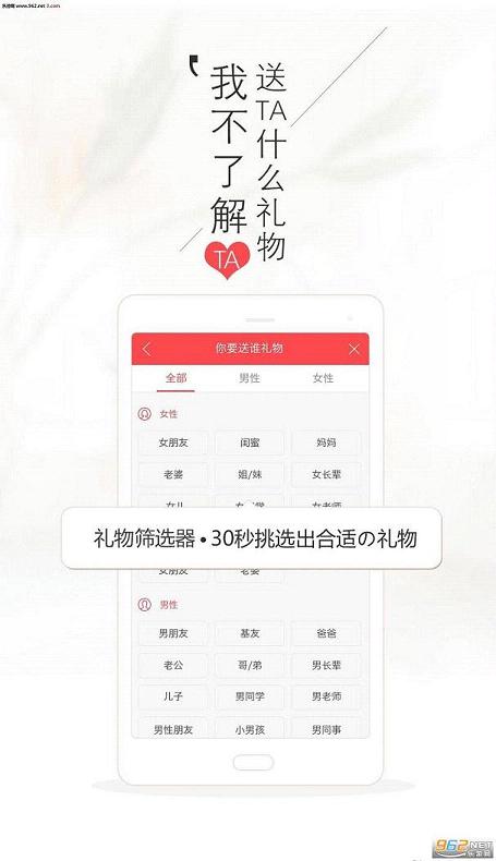 2. 礼物筛选神器——特有的“挑礼物”功能可以根据收礼对象的年龄以及送礼场合来推荐品质好礼。毕业季送老师,初次见面送客户...都能30秒挑出合适的礼物;