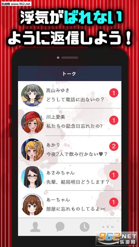 请让我出轨吧汉化版是一款日系奇葩题材类休闲手游,游戏中玩家将扮演一位出轨成瘾的男主,必须要顺利的大小女友的怀疑,玩法是不断的进行对话选择,一旦隐瞒失败,迎接你的将是血林琳的结局。