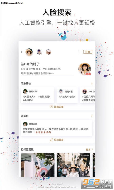 脸搜APP,为满足用户移动端智能人物搜索打造,一张照片,挖掘用户的六度人脉关系,轻松搜索查看人物相关信息。