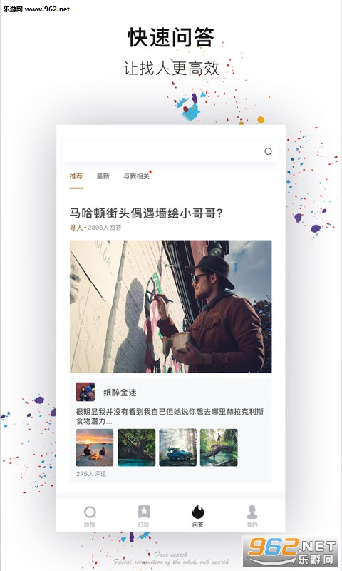 《脸搜安卓版》是一款功能强大的智能人脸搜索神器,软件拥有AR刷脸,人脸搜索,个性盯脸,快速问答功能,用户可以直接利用此平台进行人脸搜索,进行寻人招人,非常的方便,赶紧下载吧!