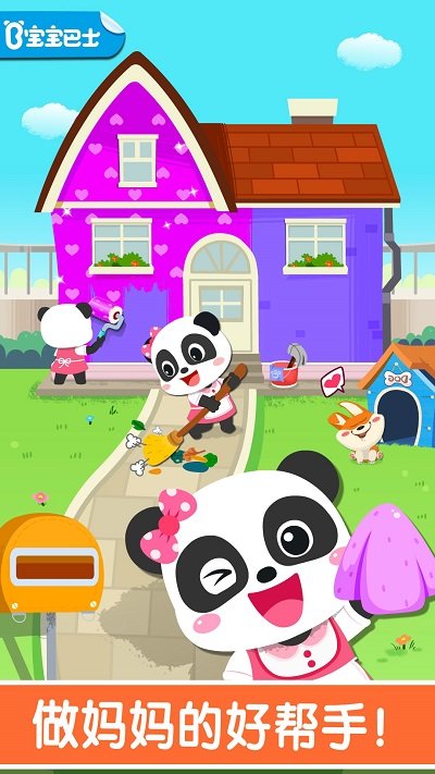小狗的房子坏了,快帮他修好房顶,再刷上漂亮的油漆,小狗看见好开心;清理破掉的墙纸,挑一张粉红墙纸贴上,家里变得好温馨!(激发宝宝创造力。)