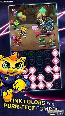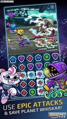 当你的敌人组织好以后,你就要参加三场比赛并且取得胜利,战斗方式要连块消除,回合制战斗,这也是从外星侵略者手里救回那些猫咪,并且强化你的队伍的唯一方式。