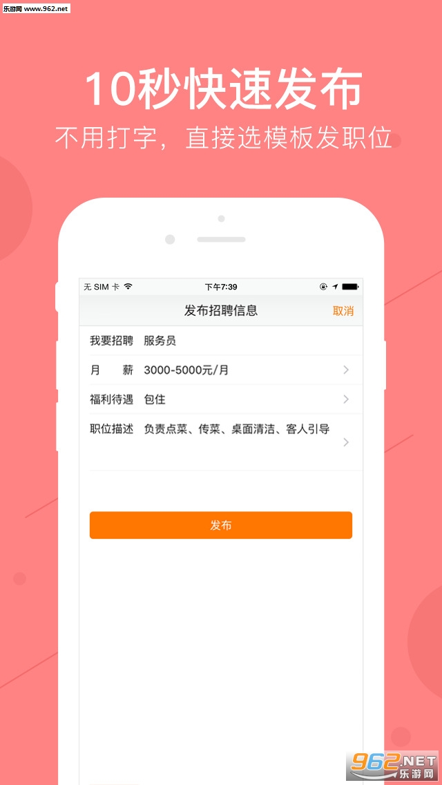 1.10秒发布职位:想招个服务员,职位描述怎么写?不用你动手写,我有全行业的个性化模板,选中发布,10秒搞定。