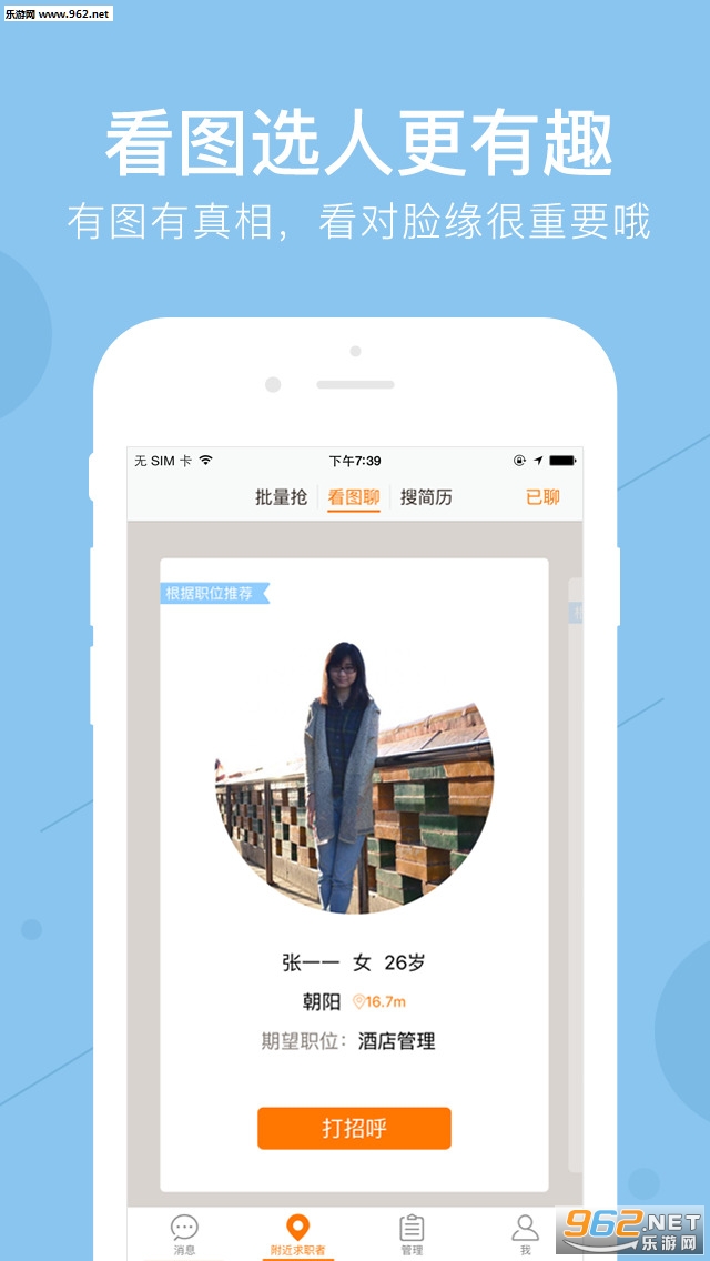 5.有图有真相:把全城找工作人的照片放到APP里,本地找工作的人都在这,老板看图选人,直接聊天,不必大海捞针,招人更有趣。