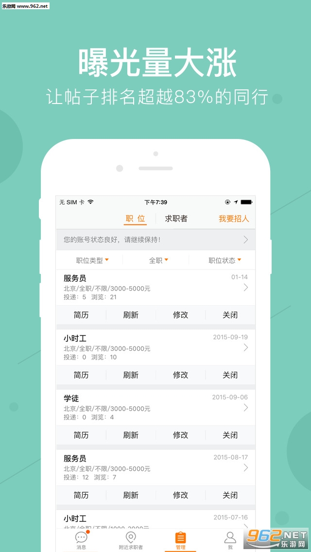 2.职位一键优化:排名靠下意味着没人投简历,一键刷新功能帮你自动优化排名,每天刷新帖子,排名超越83%的老板。