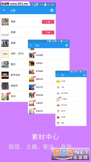 贴纸、主题、配乐、音效等海量素材,创新节日热点素材实时更新,打造时尚微电影!