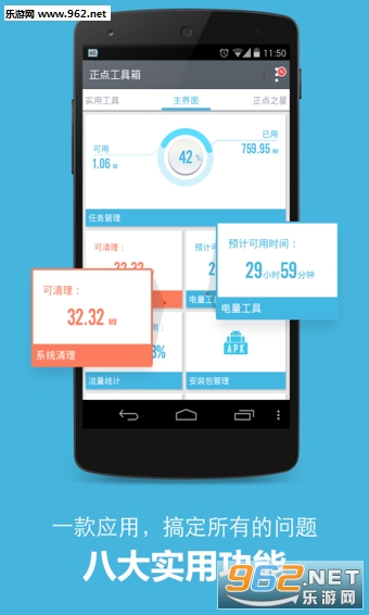 正点工具箱是一款功能强大,交互简单的手机系统工具软件。它能实时显示电量剩余百分比和可用时间、已用流量、正运行程序个数。批量移动手机上的软件到SD卡或是批量删除软件,帮助您更好地管理手机存储空间。免打扰功能让手机在预设的日期、时间段内处于静音、振动或是离线状态,休息时间不怕打扰,睡眠时间减少辐射。程序锁可以锁住短信、QQ,保护个人隐私。任务管理器杀进程保证手机高速运行。正点工具箱下载