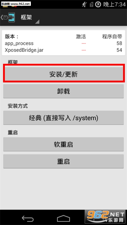 下载完后,先安装XPosed.apk。接着打开Xposed,选择“安装/更新”,然后根据提示重启手机。