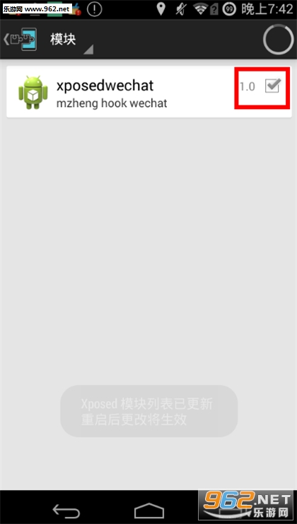 重启完后,再安装xposedwechat.apk插件。然后打开Xposed的模块界面,会看到xposedwechat这个插件。我们在这里将它选中,然后再根据提示重启手机。