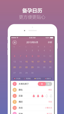 1、备孕日历:备孕避孕大姨妈例假经期排卵预测,通过排卵试纸拍照、B超测排、月经周期计算、基础体温推算等方法帮助用户记忆和预测经期及排卵期。