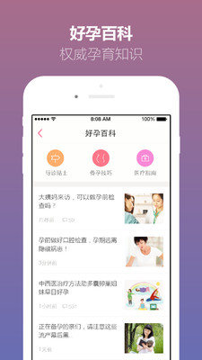 4、备孕知识宝库:精心筛选备孕、经期、生殖、妇产科疾、难孕难育等疾病常识,实用备孕技巧,为不同备孕阶段的准妈妈提供更专业、贴心的备孕知识。