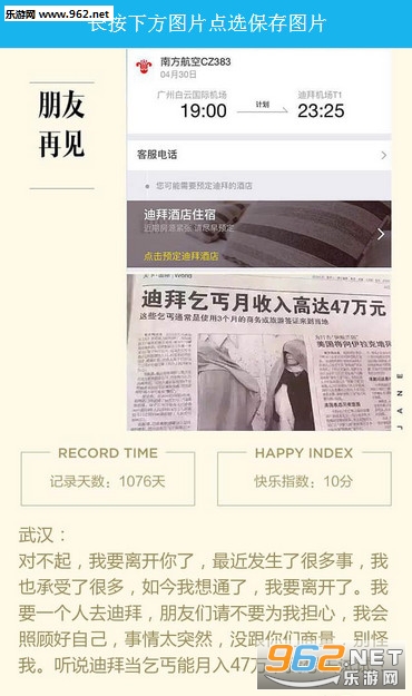 3、点击确定会生成一张从你的城市去往迪拜的机票,还附上一段离别的话语。