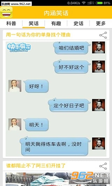 内涵笑话是一款收集了非常多搞笑的网络段子以及一些最新的搞笑图片和搞笑流行语,让你在开怀一笑的同时,不落后潮流。