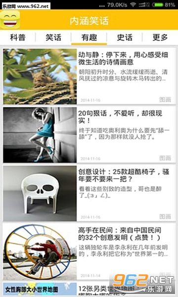 -有趣栏目将网络上有意思的人们感兴趣的图文搜集起来,这些图文可能不能像笑话一样把大家逗得哈哈大笑,但是一定能让用户在这些图文里感受到创意,感受到作者的心思 ,感觉的其中的寓意,用户在这里游览一定能在帖子中找到很多喜爱的内容。