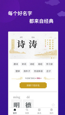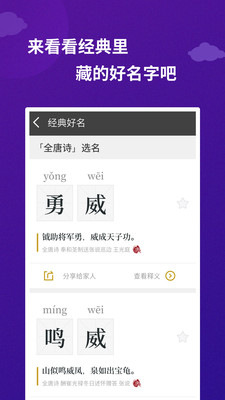 大圣起名广泛采集了各种国学经典名著和经史子集,从中甄选出寓意好、发音好、字形好的名字,供准爸爸妈妈和新爸爸妈妈们为心爱的宝贝起名使用。爸爸妈妈们为孩子取名时可以通过大圣起名查看哪些心仪的名字,并且看到他们的出处和含义,每个名字都有至少一个经典出处。