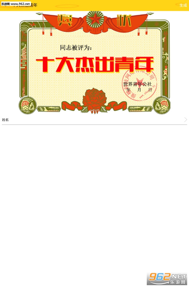 《五一十大杰出青年奖状生成器》是一款能够帮助用户轻松生成各种荣誉证书的制作工具,纯绿色无广告,即下即用。该荣誉证书制作工具界面简洁,操作简单,用户只需在软件中填写相关信息,点击生成按钮即可生成证书,很实用。