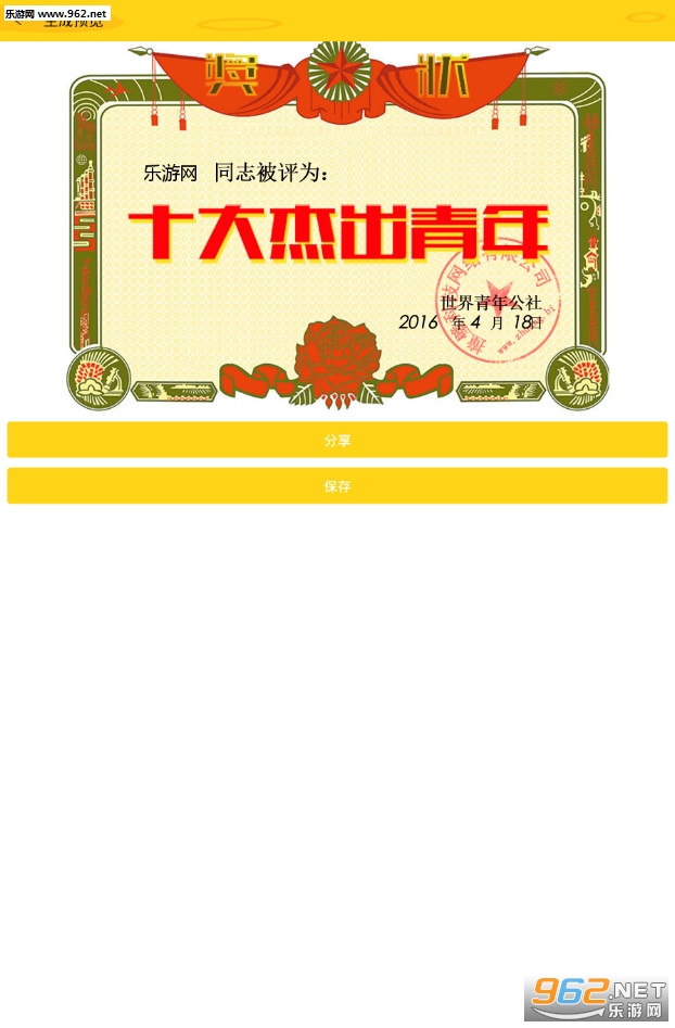 《五一十大杰出青年奖状生成器》是一款为小伙伴们打造的装逼图片制作软件,小伙伴们可以利用软件轻松制作一张大杰出青年奖状图片,在即将到了的五一期间可以晒到朋友圈中进行装逼。