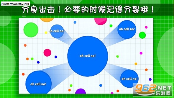游戏的操作一共就三点,一是操控摇杆来控制球球的移动方向;二是将球球一分为二;三是将球体的一部分分解到前方,从而起到加速的作用。而游戏的规则只有一个就是大球可以吃小球,游戏的目的则是排行榜的名次,在规定的时间内,最终谁的球球越大谁就是冠军。