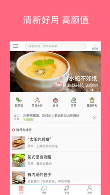 《美食天下》是一款专注美食的吃货社区,汇聚海量菜谱的常备工具,令厨房与餐桌成为一家人妙不可言的愉悦生活。 在这里最活跃的美食杰出作者与热爱生活的美食家们,通过锅碗瓢盆、菜豆果蔬,为您呈现图文并茂、无比详细的菜谱,以及挥洒自如、满座惊艳的创意美食。