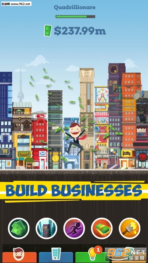 《点击大亨》(Tap Tycoon – Country vs Country)给笔者的第一印象,与那些以收集为主的点击游戏机制十分类似,玩家通过点击屏幕不断收集金钱,之后再去购买与升级各种建筑,比如饭店、夜总会、邮局、宾馆等等。随着时间的推移,玩家单次点击获取的金钱数量会呈指数级别增加,而升级需要耗费的代价更是天文数字。