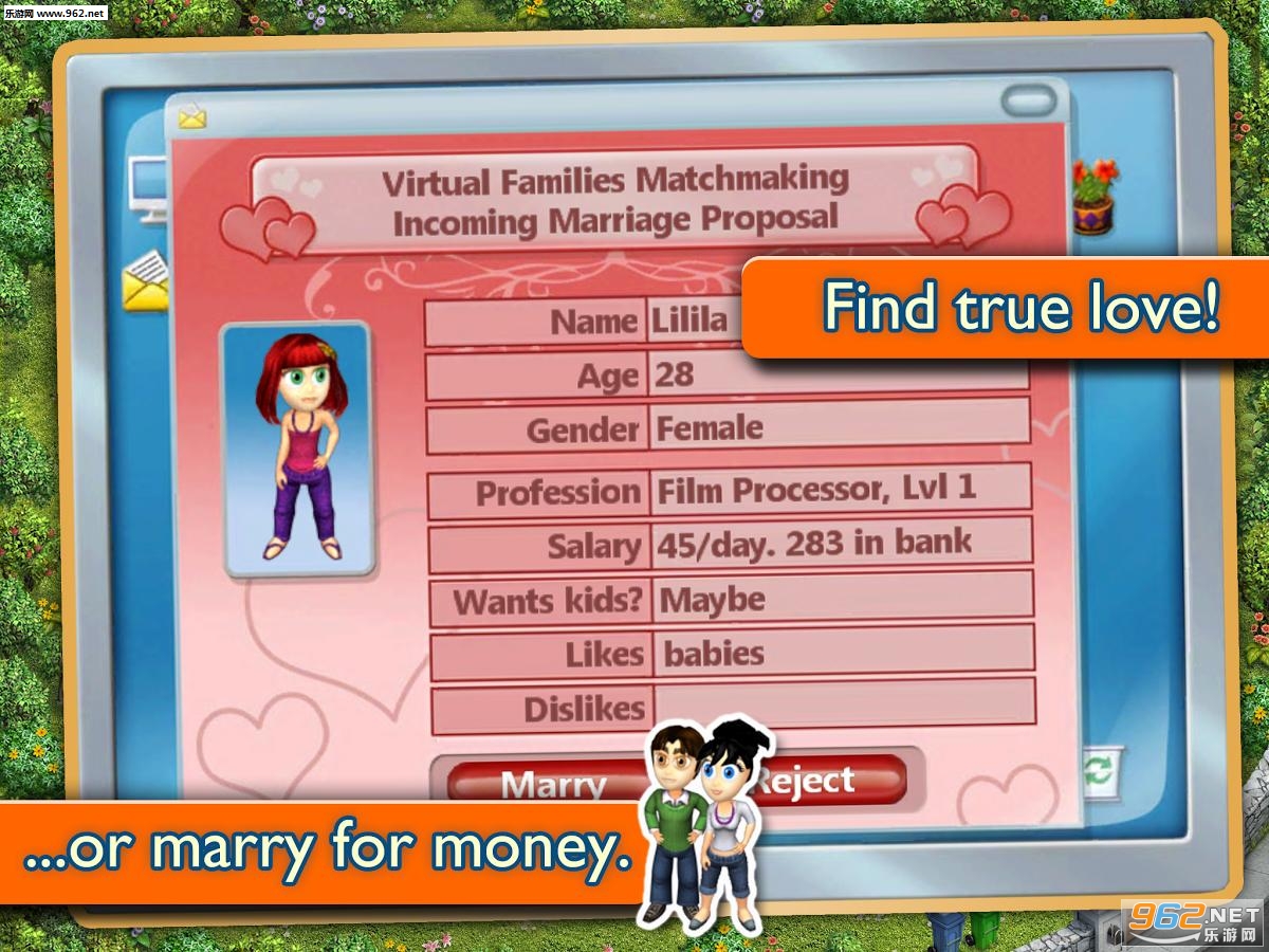 好吧这就是废话一句,没有配偶哪里来的孩子是不是?当我们选择好人物进入游戏后,请时刻注意屏幕右上方的邮件提醒,是的,你小人今生的伴侣是通过网恋获得的!拖拽小人至电脑及时查收邮件可以获得各式相亲对象信息,当看到中意的对象时选择Marry结婚(Reject为拒绝)。
