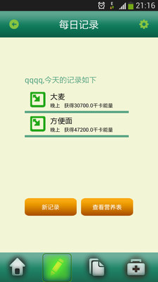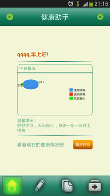 健康助手,为您提供健康生活。本应用为广大用户提供了一种健康的饮食习惯,并记录了广大用户每天的工作量,从而做了一个简单的统计,以帮助用户改善自身的饮食以及运动量,增强体质