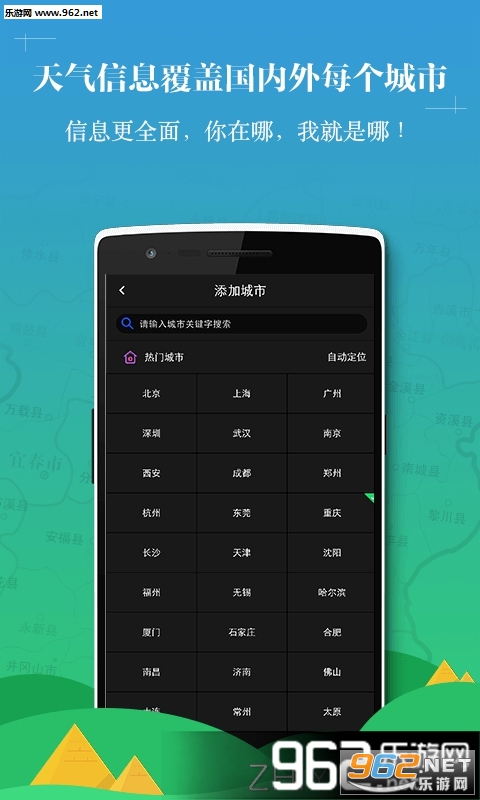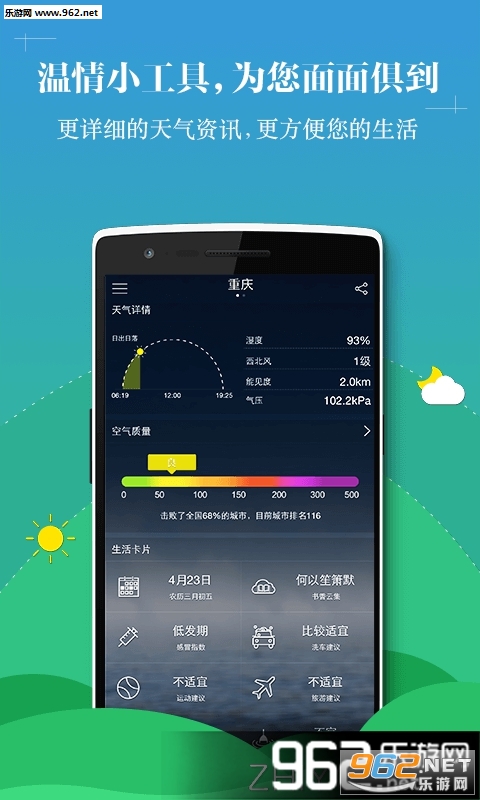 完备的天气信息:语音播报、十天天气预报、24小时天气预报、空气质量指数、空气污染指数、pm2.5、风力、湿度、温度、日出日落、气压、能见度、生活建议、紫外线、钓鱼指数、穿衣指数、洗车指数、感冒指数、运动指数、旅游指数
