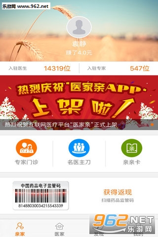 【亲亲卡】医家亲独有的亲亲卡,当你购买相关药品后,扫描药盒上的中国药品电子监管码,立即获得返现。