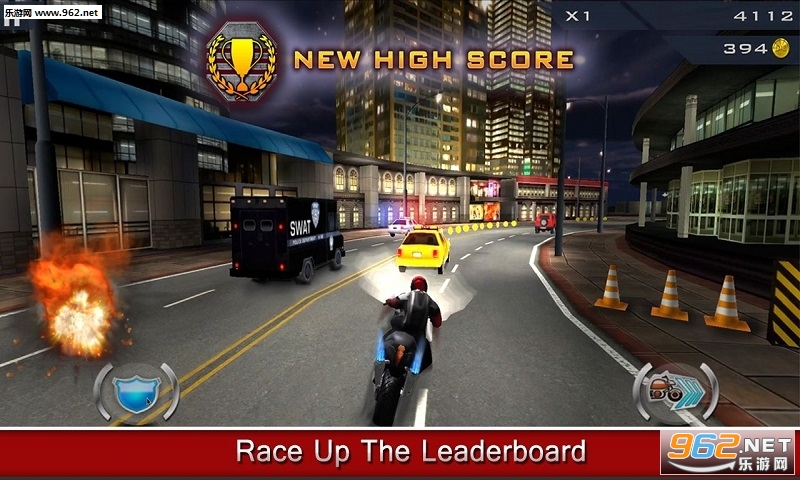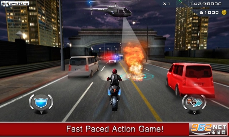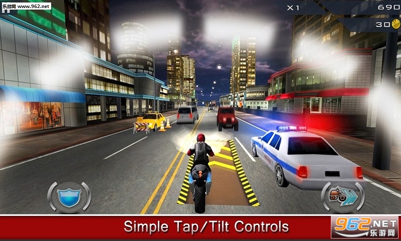 游戏中你要通过轻晃手机与点击按键来控制赛车行驶,交通阻塞、警察、直升机、摩托车都会成为你前进道路上的障碍。你可以积蓄能量并在关键时刻释放声波来清除前方的阻碍。拧动手把,用极速甩开那些难缠的警察吧!