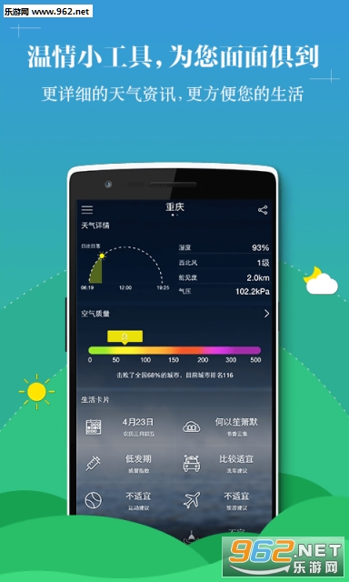 包含全国3000多个城市天气信息,采用国内外多家气象机构数据,天气信息权威、准确、全面。提供信息全面24小时预报、精准的未来3天预报。空气质量、污染指数、温度趋势、PM2.5 等更加丰富、精准天气信息!提供穿衣、洗车、紫外线、感冒、运动、旅游等生活指数,是您日常生活、出行旅游的必备APP!