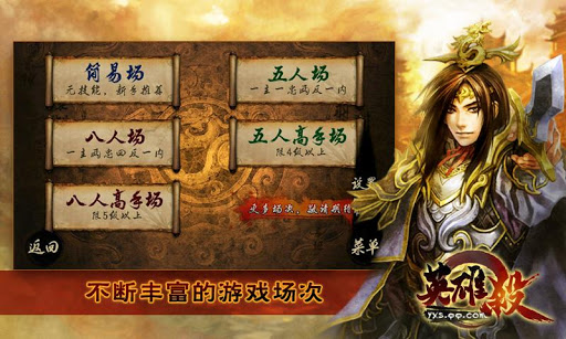 ★《英雄杀》是由PC版英雄杀原班团队精细打造而成。Android版的英雄杀与PC版英雄杀一样提供了主公,忠臣,内奸,反贼四种角色,包含了古代各色英雄。既有如秦始皇、李世民,曹操这样的千古帝王,又有时迁、李逵这样的民间英雄,还有西施,陈圆圆,李师师等等绝色佳人,可谓英雄美人齐聚!整个“杀人”游戏过程充满着智慧与人性的对决,紧张有趣,需要冷静的判断和智慧才能获取胜利。