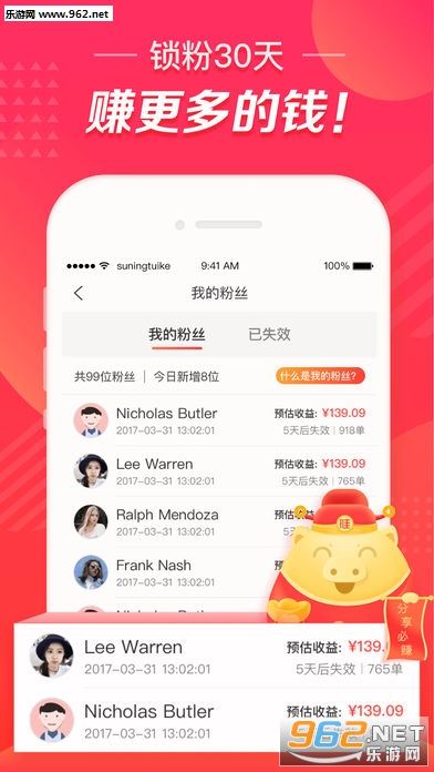 只要使用最新版苏宁推客App分享商品链接,成功邀请好友下单,并完成购买,可锁定好友为自己的粉丝,并享受30天超长锁佣!据目前的推客锁粉情况预估,每新增一名粉丝,每个月可增加10元额外收入。(详细查看活动规则)
