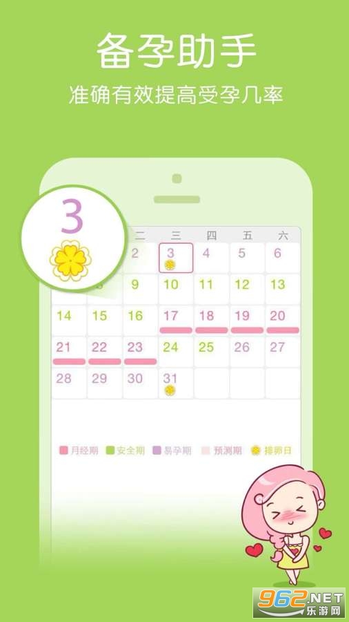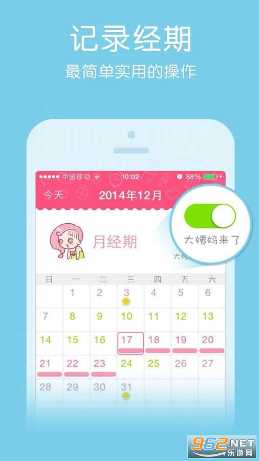 专为女生设计的经期管理工具。预测准确、记录方便,还有图形化的统计信息,帮助你更了解自己。这也是一本女性日历,月经周期、排卵期、排卵日、安全期、易孕期等等,标识清楚、一目了然。根据科学的预测和周到的提醒,帮你做好避孕或备孕的准备,让例假不再尴尬。