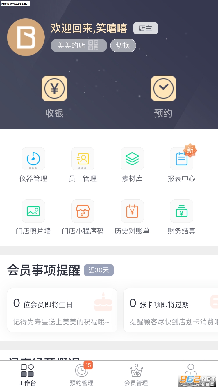2.员工工作台在员工工作台里,展示了“员工当前收入”,“今日预约”,“待填护理日志”,“待回访会员”四个板块。基本涵盖了皮肤管家的工作流程。