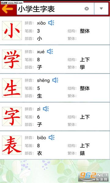 《小学生字表最新版》是一款为小朋友们打造的汉字学习软件,软件中有着小学 一年级到六年级中出现的常用汉字,带拼音部首等,可以跟着笔画和配音学习一个个汉字。