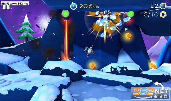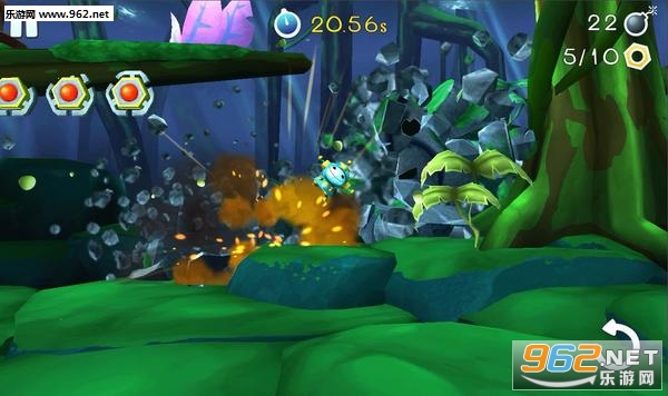 而在画面方面,《Boombot》手机版使用了精致漂亮的3D画面,这一点可比原flash版提高了很多很多,主角小机器人将在丛林、雪地、荒漠等众多场景中冒险旅行,只是用炸弹来作为动力,这方式也忒酷了。