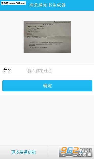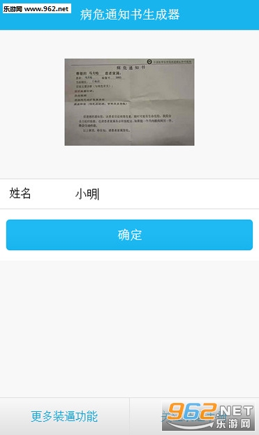 《朋友圈病危通知书图片生成器》是一款专门用来装比的搞笑图片生成器。这个应用可以帮助你免费生成一张病危通知书图片,无需你进行PS,只需要输入名字,就能一键生成一张这样的图片。