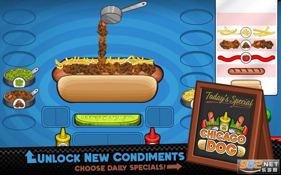 客户偶尔会为您带来独一无二的特殊食谱,你可以在热狗作为每日特价!每个特殊的也有奖励,你可以赚其宗旨是服务方的一个最好的例子。当你发球足够特价掌握那几招,你也将获得特别奖!