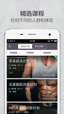 训练计划针对不同人群、各种器械和阶段健身目标组合编排,适用最广泛的健身场景。