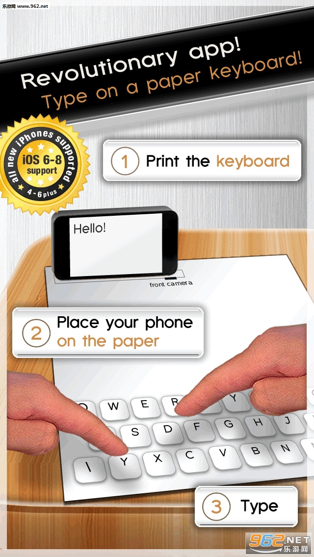 《纸上键盘》与《纸上弹琴》同出一家的神奇应用,工作原理一样,你只要把键盘的图案用A4大小的纸张印出来,再用手指去敲打纸上的键盘。