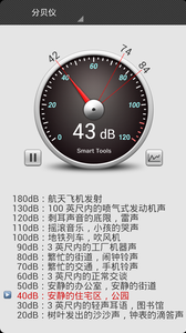 随时随地检测环境分贝! 一款利用手机麦克风来测量环境噪声、分贝(dB)大小的软件,测试后将显示一个数值供参考。通过这款小工具,你就能够轻松的测量出当前环境的噪声水平,操作简单、使用方便。当周围环境的分贝值过高,会对人的心理及生理产生危害,噪音对听力功能也会有损。所以最好不要长时间暴露在这样的噪声之下。为了您和家人的身心健康,赶快检测一下您周围的噪音分贝值吧!